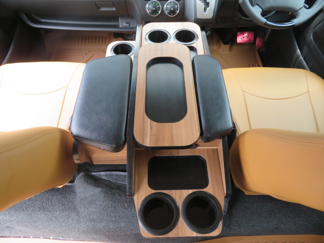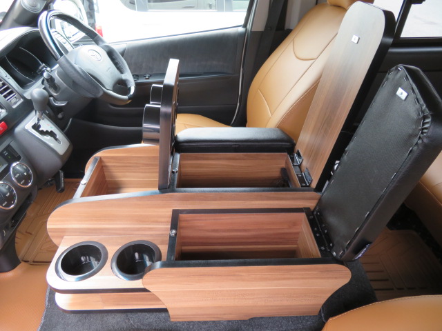 送料無料!ご来店時の場合は送料分のお値引きと取り付け工賃も無料!!ハイエース200系 ワイド S-GL専用に製作したコンソールボックス。専用設計のため、まるで純正品のようにぴったりとフィットした取付が可能です。アームレスト、ドリンクホルダー、USBコンセントなど、様々な機能が運転時の快適性を向上させます。